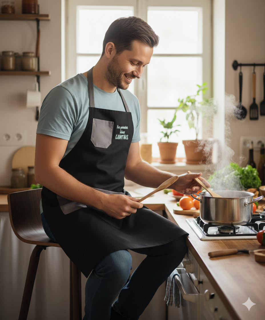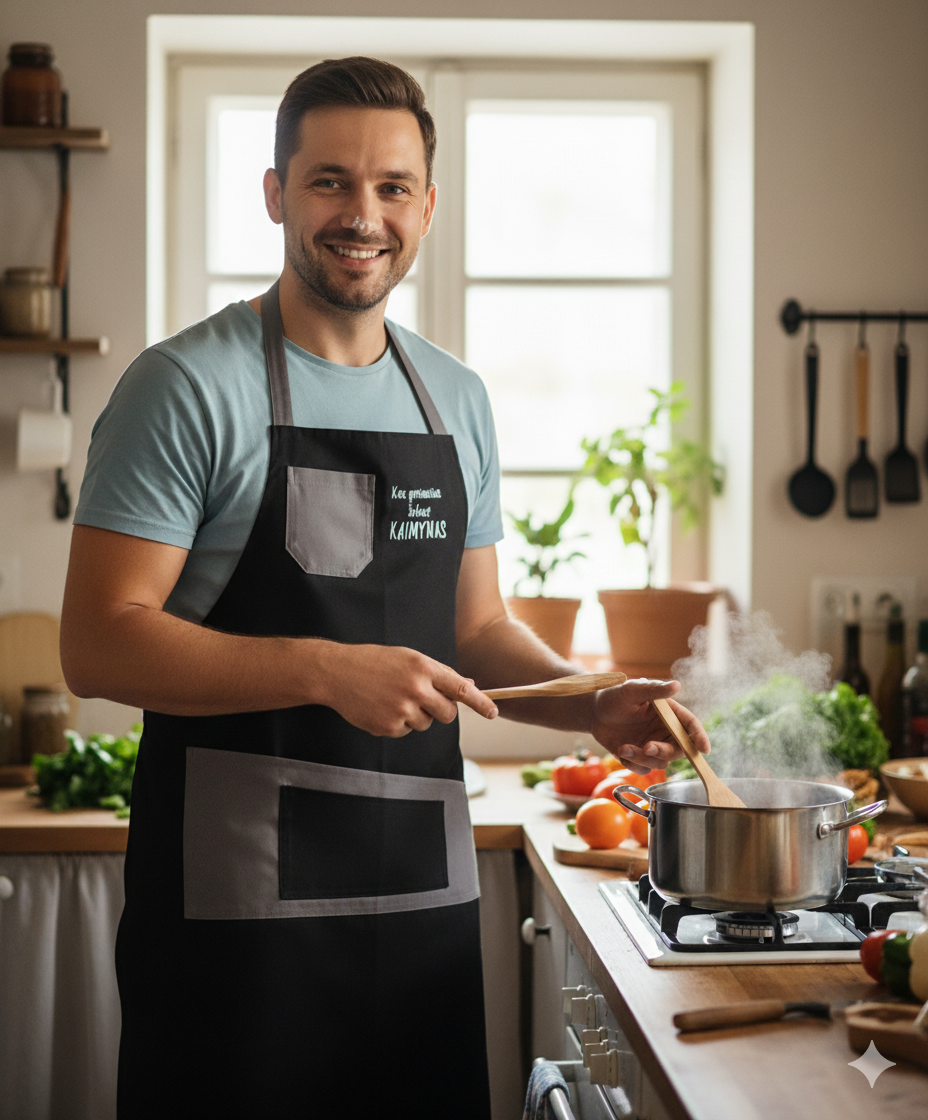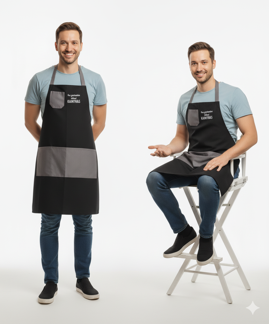 Ant prijuostės galime išsiuvinėti bet kokį tekstą nemokamai arba logotipą (papildoma kaina 5-10 eurų).