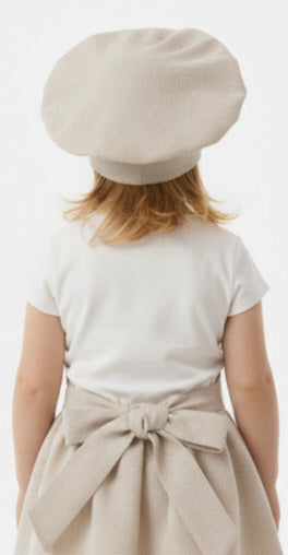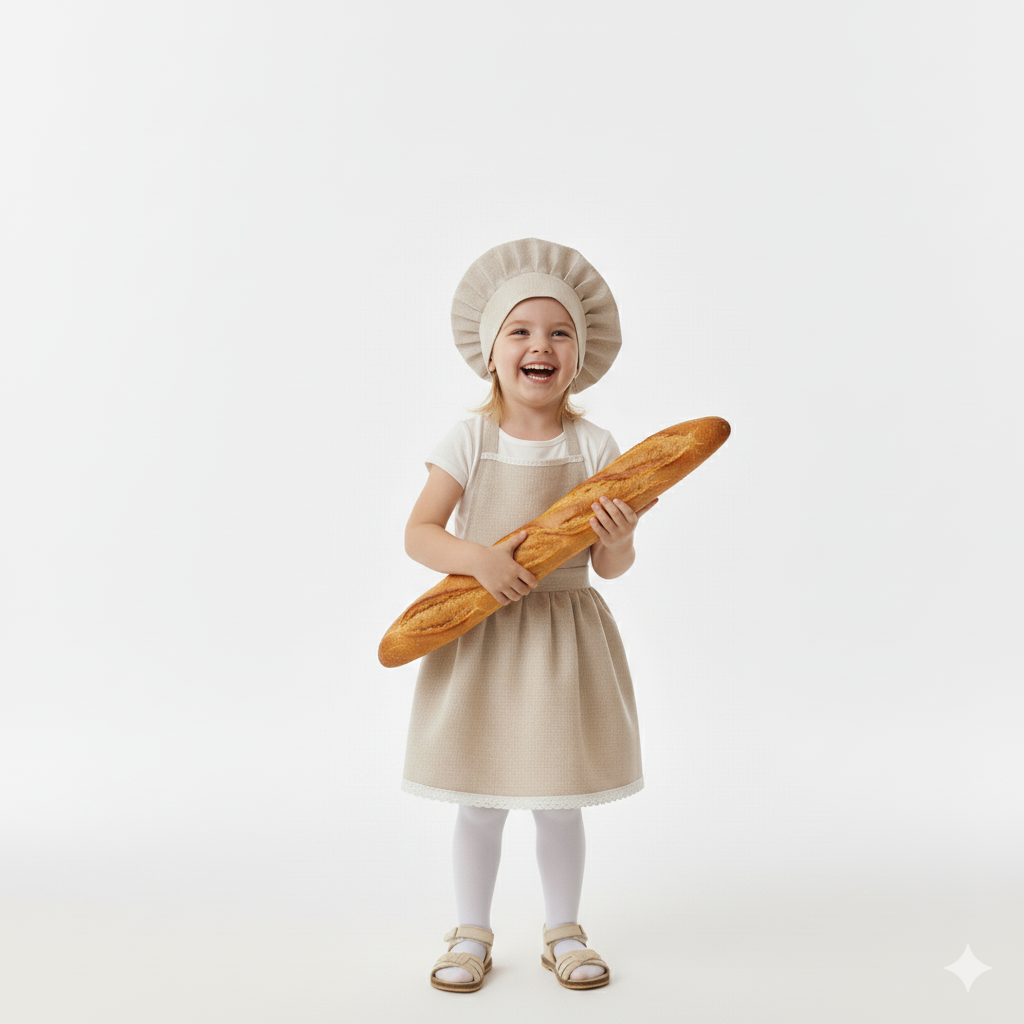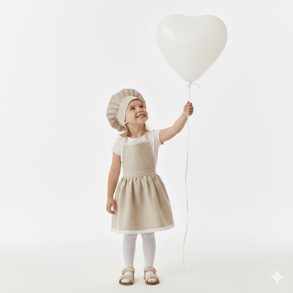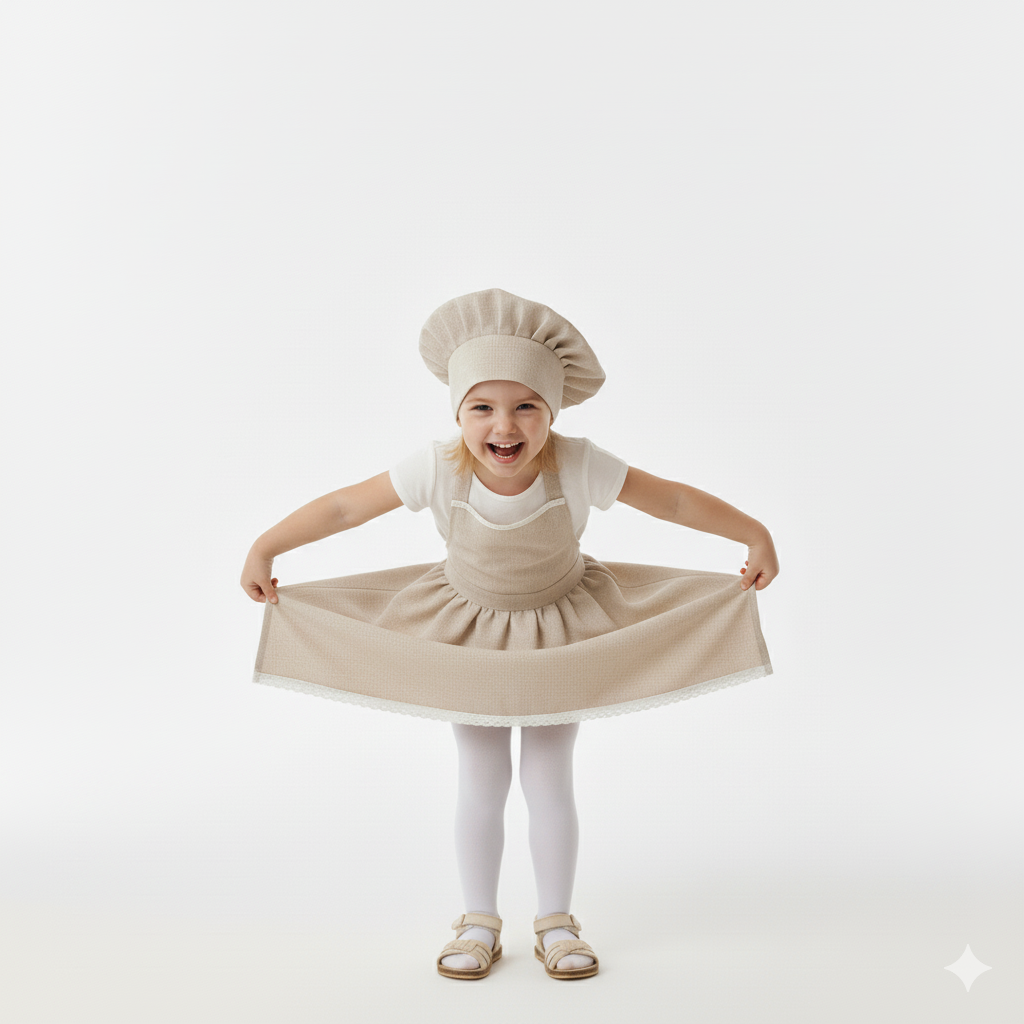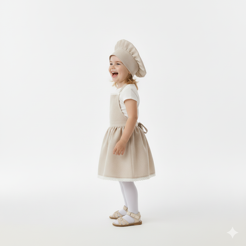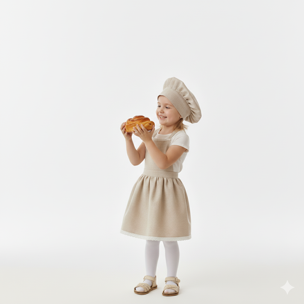 Vaikiška prijuostė iš natūralaus, minkšto lino su nėriniu mažajai pagalbininkei. Prijuostės grožį papildo mielas galvos aksesuaras iš derančio audinio, šefo kepurė.