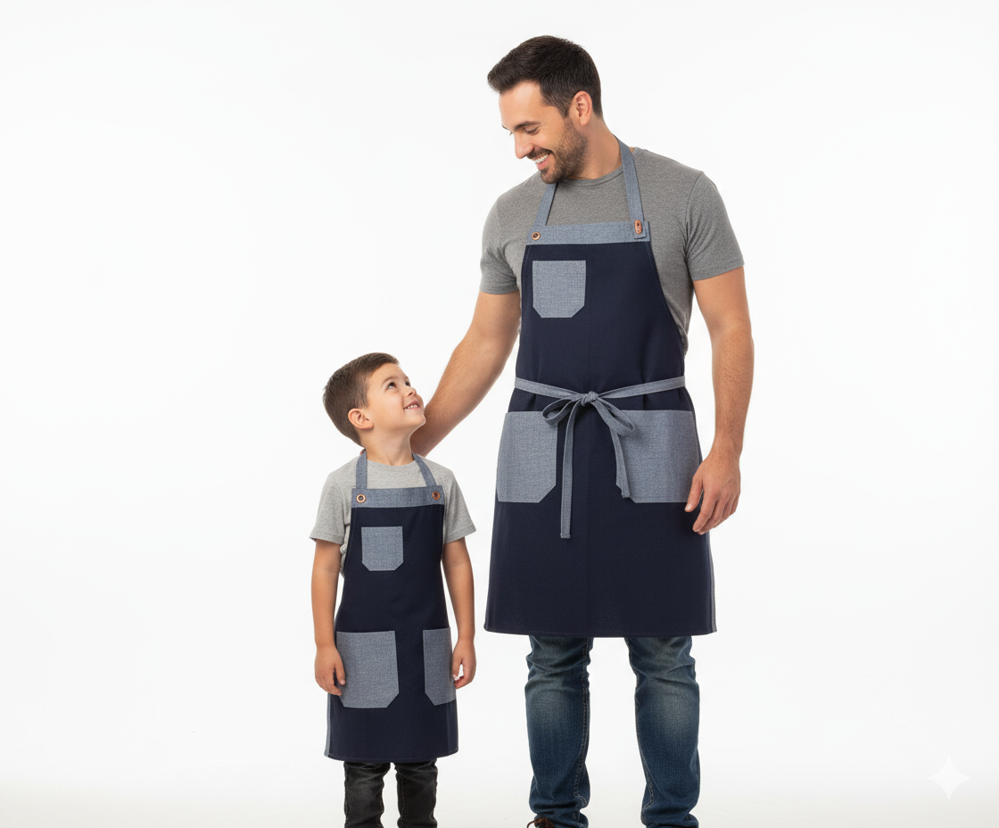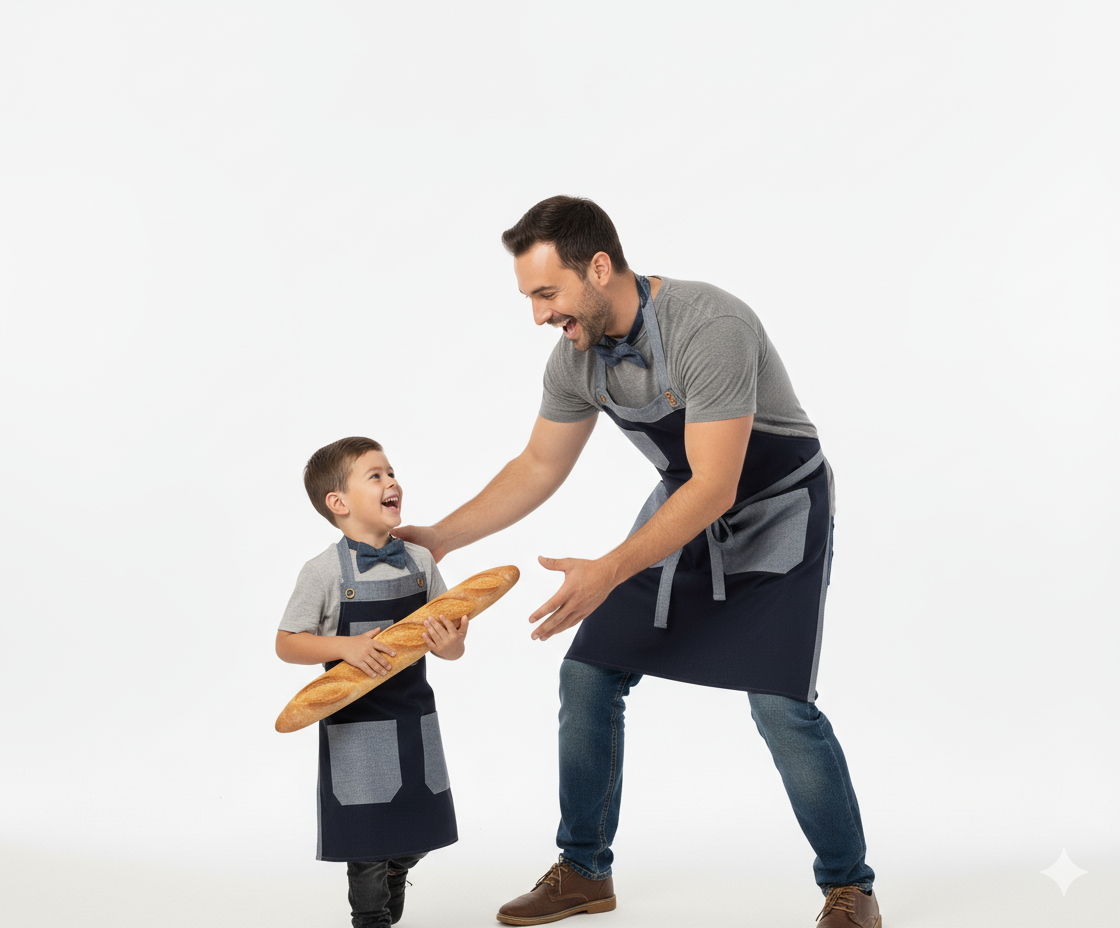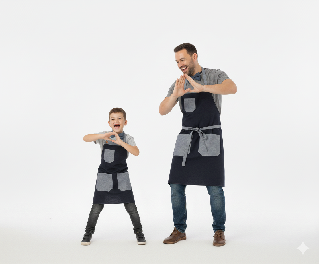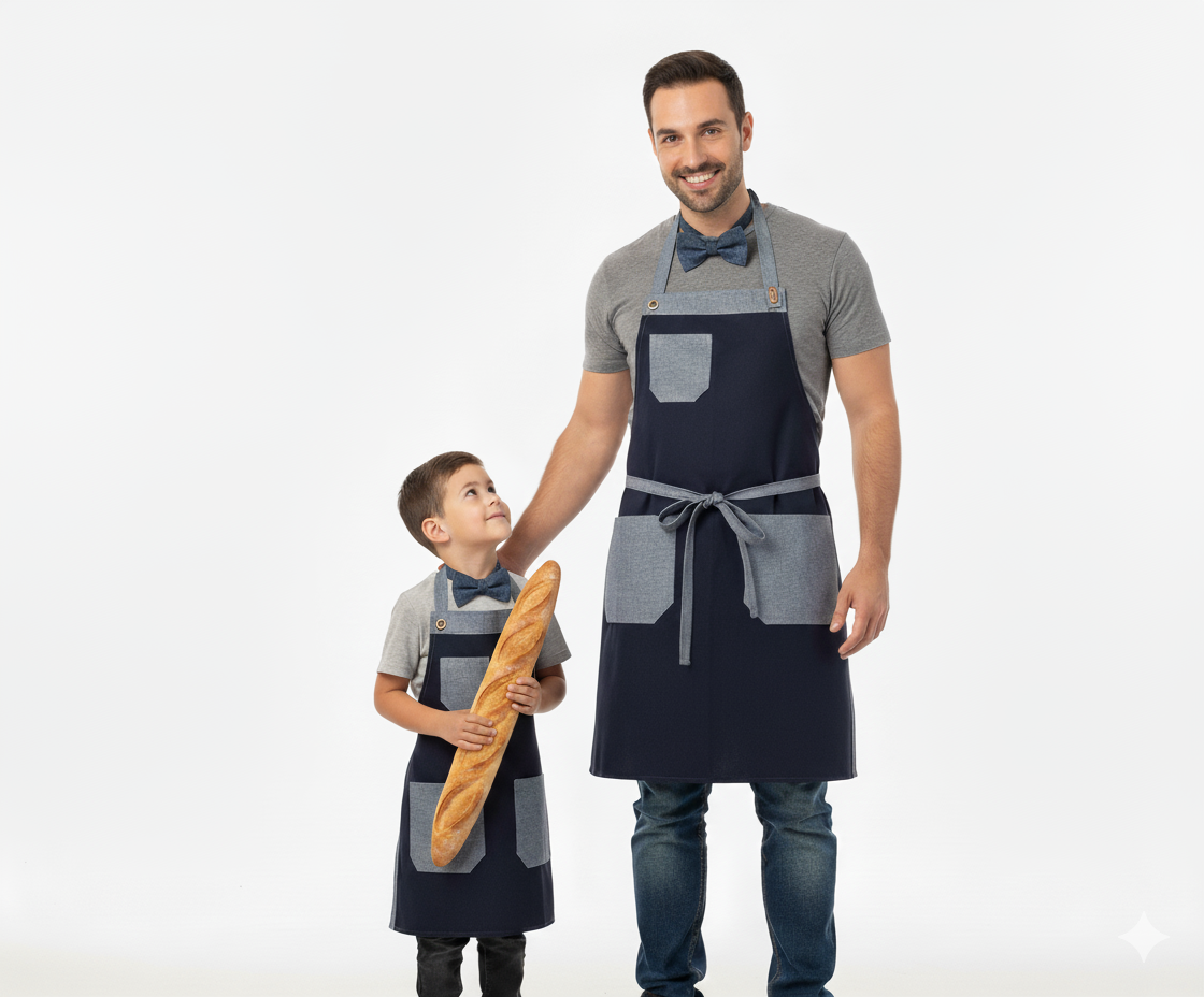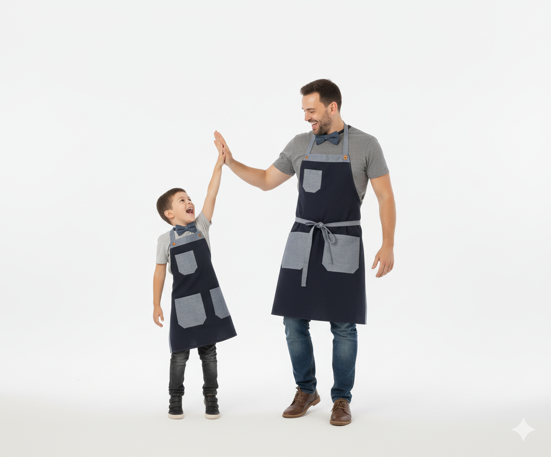 Dvi derančios prijuostės tėveliui ir sūneliui - jo mažajam pagalbininkui. Prijuosčių komplektą papildo dvi mielos džinsinės peteliškės.